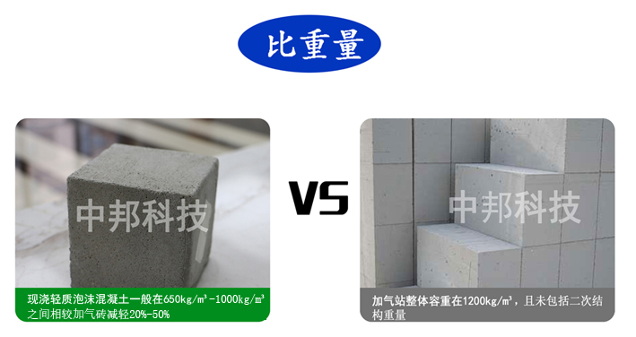 現(xiàn)澆輕質(zhì)泡沫混凝土墻體一般為650kg/m³-1000kg/m³之間,相較加氣磚墻體同等強度容重更輕,可減輕20%-50%;